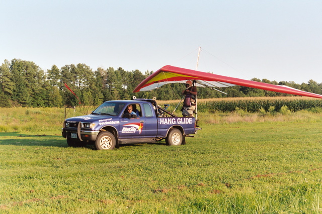 Platform towing starts with the pilot and glider on the back of a truck or trailer platform attached to a line on a payout winch where the line starts out short and gradually gets longer. The pilot is launched off the moving vehicle and climbs as the line is fed out with a hydraulic braking system that is monitored from the vehicle. The line keeps getting longer as the pilot climbs to altitudes between 800 and 1500 feet on the length of runway we have available. The pilot then can release at the end of the tow and continue searching for thermals or just practice turning and landing approaches that are always supervised.